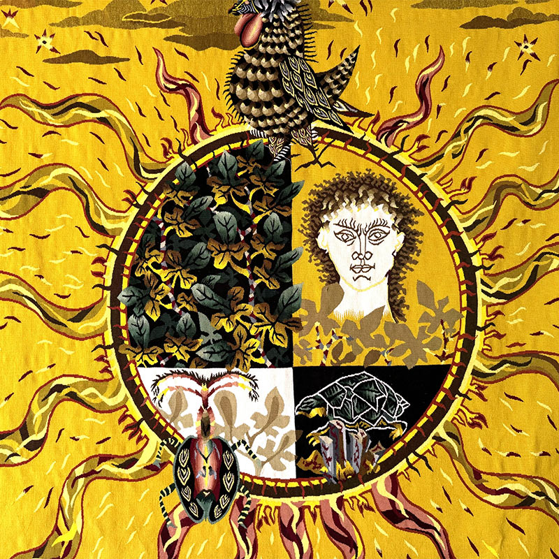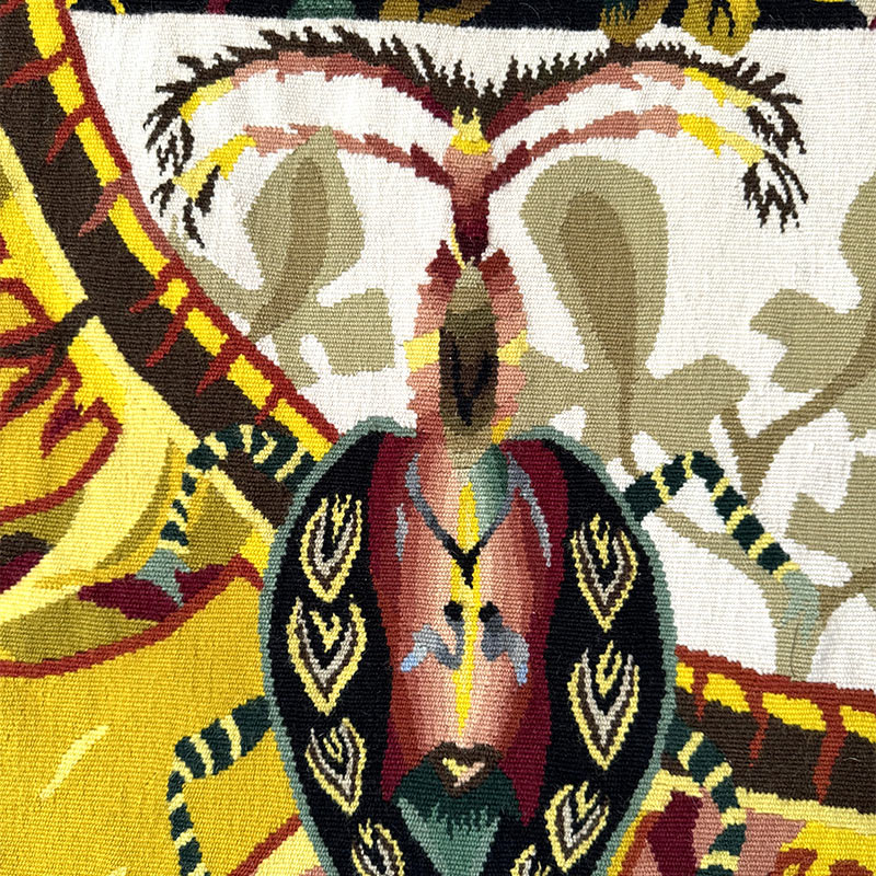 The inner circle is divided into four quadrants, each with distinct imagery, possibly symbolizing different aspects of “yellow loves” — a poetic term potentially referencing youthful love, jealousy, or even betrayal (a nod to Tristan Corbière’s Les Amours Jaunes, the 1873 poetry collection that might’ve inspired Lurçat). The four quadrants evoke varying dimensions of romantic experience: blooming foliage for growth and abundance; a stylized human face representing the beloved or the artist; an ornate butterfly symbolizing ephemeral beauty and transformation; and a tortoise, a counterpoint of endurance and reflection. Surrounding these are surreal birds and botanical elements, guardians of the emotional world Lurçat maps in his uniquely poetic style. Woven as a singular piece at the historic Atelier Tabard in Aubusson, this tapestry is both a technical and emotional tour de force — a luminous example of mid-century modernism’s embrace of myth, nature, and the human heart.