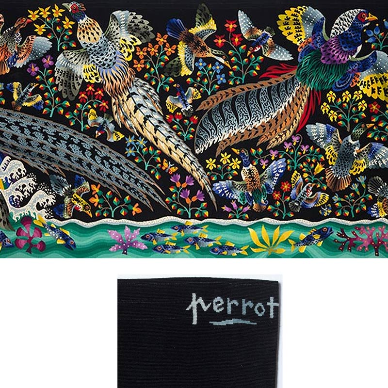René Perrot was a renowned tapestry designer. He crafted exceptionally intricate renderings of nature. “La Grande Cascade” (The Great Waterfall), which is a narrative of the swan’s farewell song, stands as a veritable masterpiece. Its length of over eight meters confirms its exceptional status as one of the largest and finest Aubusson tapestries, and it marks Perrot’s crowning achievement.